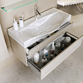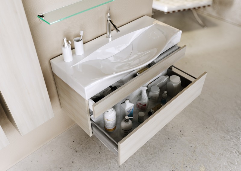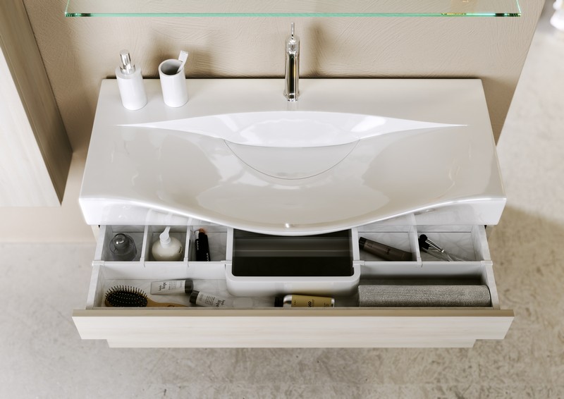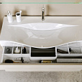 Фасады и боковины коллекции изготавливаются из высококачественного МДФ (древесноволокнистой плиты повышенной плотности) и покрываются: 5 слоями высокоглянцевой эмали (в белом цвете) или структурированной высококачественной пленкой (в цвете акация). Умывальник из литьевого мрамора с оригинальной чашей и декоративной вставкой на месте слива. Гарнитуры могут быть как подвесными, так напольными. Верхний ящик оснащен системой разделения внутреннего пространства. Также выполнена отделка внутренних элементов мебели особым цветом (Eolo), напоминающим ткань. Мебель комплектуется влагостойкими зеркалами с серебряной амальгамой, фоновой подсветкой и выключателем.